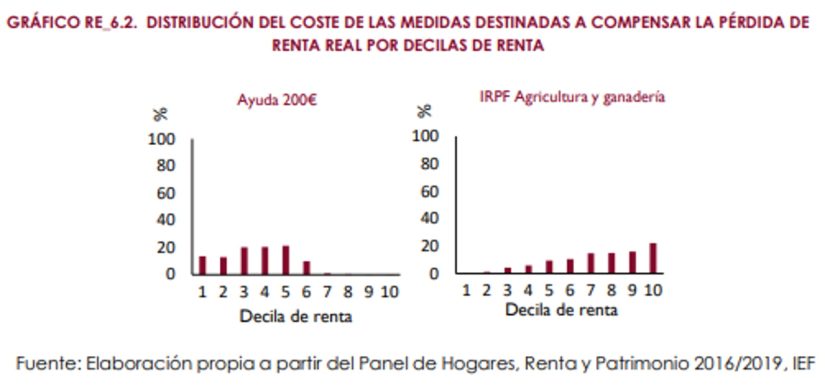 «Las medidas vinculadas al nivel de renta, como la ayuda de 200 euros a personas de bajo nivel de ingresos, son de naturaleza focalizada por su diseño y, en este caso, concentra su coste en hogares de renta media y baja», ha destacado la AiREF. Por su parte, «las reducciones fiscales a agricultores y ganaderos benefician principalmente a los hogares de ingresos medios y altos», ha apuntado.