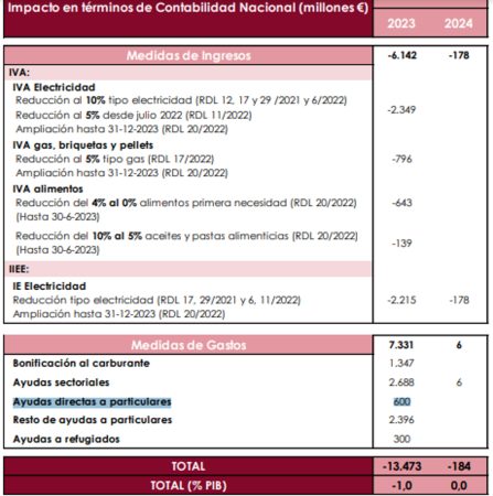 Así, destaca la prórroga de la bonificación por litro de carburante para agricultores y transportistas, de casi 1.400 millones de euros; el descuento en los bonos de transporte que se canalizan parte como transferencia a Renfe por casi 700 millones, y a través de las administraciones territoriales, por casi 400 millones. En total, se han dado 7.500 millones de euros, un impacto directo del 0,5% del PIB. En caso de prorrogar estas ayudas hasta finales de año, el impacto en el PIB sería de un 1%, hasta los 13.473 millones de euros.