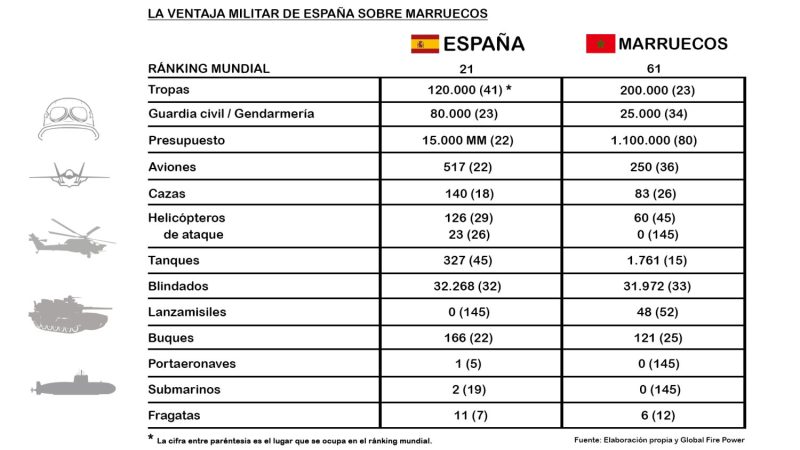 España goza aún de una notable superioridad militar sobre Marruecos, fruto de su potencia demográfica, económica y del índice de desarrollo europeo. Según los analistas de Global Fire Power (una consultora militar), España está en el puesto 21 de las potencias militares del mundo. Si bien lejos del lugar que le corresponde a la 14ª economía del mundo y 4ª de Europa, aún a considerable distancia de Marruecos, que está en la posición 65 del ránking, que analiza 145 países.