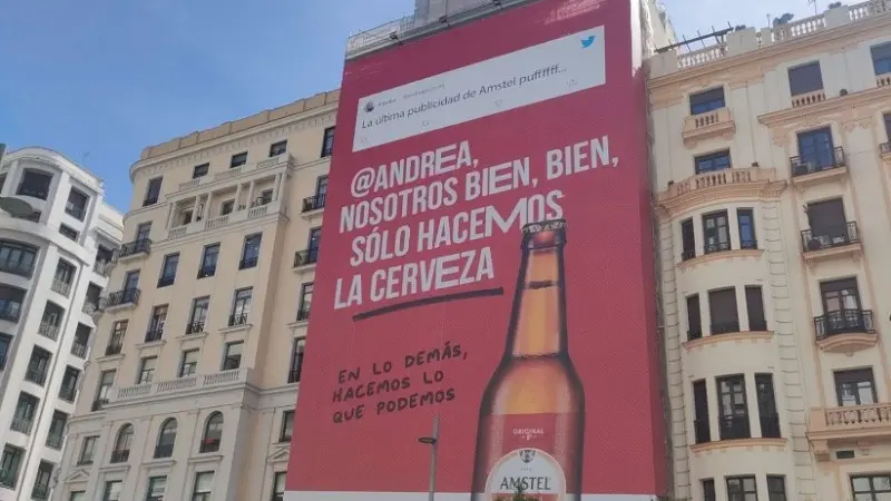 ‘La última publicidad de Amstel pff…’ este es el mensaje de una usuaria de twitter tras la nueva campaña publicitaria de la cervecera, que no tardó en responderle con humor ‘Nosotros bien, bien sólo hacemos la cerveza, en lo demás lo que podemos’. Han aprovechado este mensaje para colgar una lona de publicidad en la Gran Vía de Madrid.