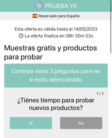 PruebaYa.com es una página web en la que hay que tener un extremo cuidado al usar este sitio, ya que es una estafa. Deja poco a la imaginación de los usuarios, todo son promociones y premios que con solo registrarte o con solo responder una pregunta como por ejemplo ¿Qué edad tienes?, ya ganas un premio, que puede ser un lote de productos de alimentación a el magnífico precio de 0 euros.