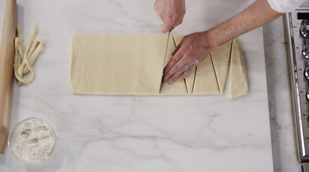 El primer paso para hacer cruasanes de mantequilla con chocolate es extender una lámina de hojaldre sobre un papel de cocina, para evitar que se pegue a la mesa. Tienes que cortar la lámina en sentido horizontal y te quedarán dos rectángulos. Cada una de esas mitades se corta formando triángulos alargados, desde unos cuatro centímetros de los bordes. Separa cada triángulo y hazles un corte de un centímetro en la base. Si crees que no vas a tener cruasanes suficientes, puedes usar una o dos láminas adicionales de hojaldres.
