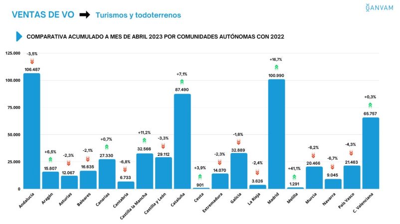 En un análisis por comunidades autónomas, los datos muestran que, en los primeros cuatro meses del presente ejercicio, Madrid ha sido la segunda comunidad donde más aumentaron las ventas respecto a 2022, con un crecimiento cercano al 17%, hasta las 100.990 unidades, solo superada por el aumento del 41,1% de operaciones de Melilla.