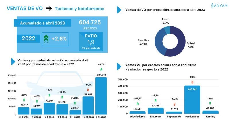 Las ventas de turismos de ocasión acumulan un total de 604.725 unidades vendidas hasta abril de 2023, lo que supone un 2,6% más con respecto al mismo periodo del año anterior, según datos de la Asociación Nacional de Vendedores de Vehículos (GANVAM). Unos datos que marcan en positivo las expectativas del Salón del Vehículo de Ocasión (VO) y Seminuevo de Madrid 2023, que se celebrará del 13 al 18 de junio, organizado por IFEMA MADRID y promovido por GANVAM.