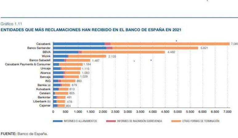 Todavía no se han hecho públicos los datos correspondientes a 2022, así que los datos que hay son los relativos a 2021. Según consta en la Memoria de Reclamaciones del Banco de España, Caixabank es el banco que recibió más reclamaciones ante el supervisor (7.089). Banco Santander ocupa el segundo lugar con 5.821 y BBVA se encuentra en el tercer lugar (4.482). En cuarta posición, Wizink (2.125) y en el quinto lugar aparece Banco Sabadell (1.487). Después vienen Caixabank Payments & Consumer (1.184), Unicaja (1.115), Abanca (1.083), Iberc aja (1.029), ING (893), Bankia (679), Kutxabank (613), Cetelem (605), Bankinter (491), Liberbank (478) y Cajamar ( 464).