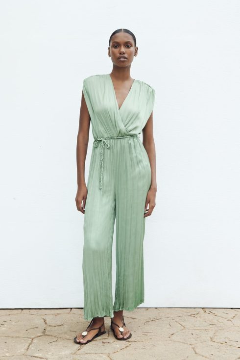 Zara nos trae este mono en color verde agua con efecto arrugado. Este tipo de prendas fluidas son la mejor opción para ir cómoda a cualquier tipo de cita, puedes llevarlo para comer con amigas como para ir al cine ya que es muy versátil y con los complementos puedes adaptarlo para cada ocasión. Tiene una cintura elástica y un cinturón trenzado que te ayudará a ajustar la cintura. Consigue esta prenda tan especial por el precio de 35, 95 euros.