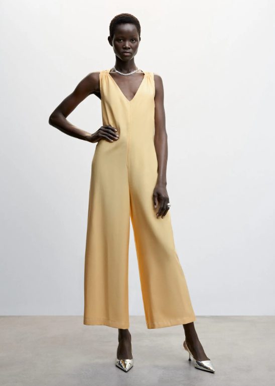 Este mono fluido puede ser una opción tanto para una cita romántica, un evento o incluso para salir con amigos. El diseño es la clave de la versatilidad. Tiene un escote en pico con tirantes anchos que cruzan en la espalda. Para asegurar su comodidad tiene un forro interior que evita posibles transparencias. Para adaptarlo a cada situación es fundamental elegir los complementos adecuados. Anteriormente se podía conseguir esta prenda en distintos colores sin embargo ya solo esta disponible en amarillo por un precio de 39,99 euros.