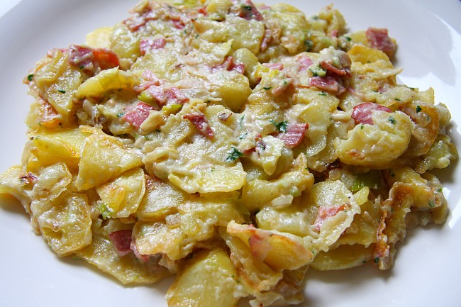 Después de retirar el aceite de la sartén (guárdalo, ya que puede ser utilizado en otra ocasión), añade el bacon ahumado previamente troceado y fríelo ligeramente. El objetivo es resaltar su sabor y que se cocine un poco. Luego, coloca el bacon sobre las patatas en la fuente reservada. A continuación, pela los huevos duros, córtalos en trozos pequeños y espolvorea la fuente con ellos.