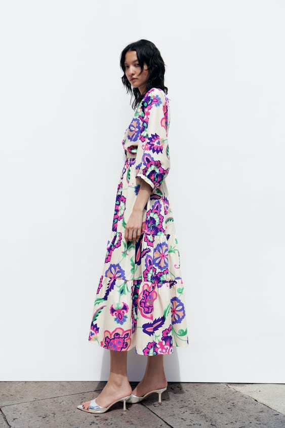 Las mangas amplias con sutil volumen y un largo perfecto hasta debajo del codo son otra característica destacable de este vestido. Pero lo mejor de todo es su estampado floral en tonos rosas, morados, coral, verde y turquesa, que son un cóctel de vitaminas para el rostro y rejuvenecen muchísimo.