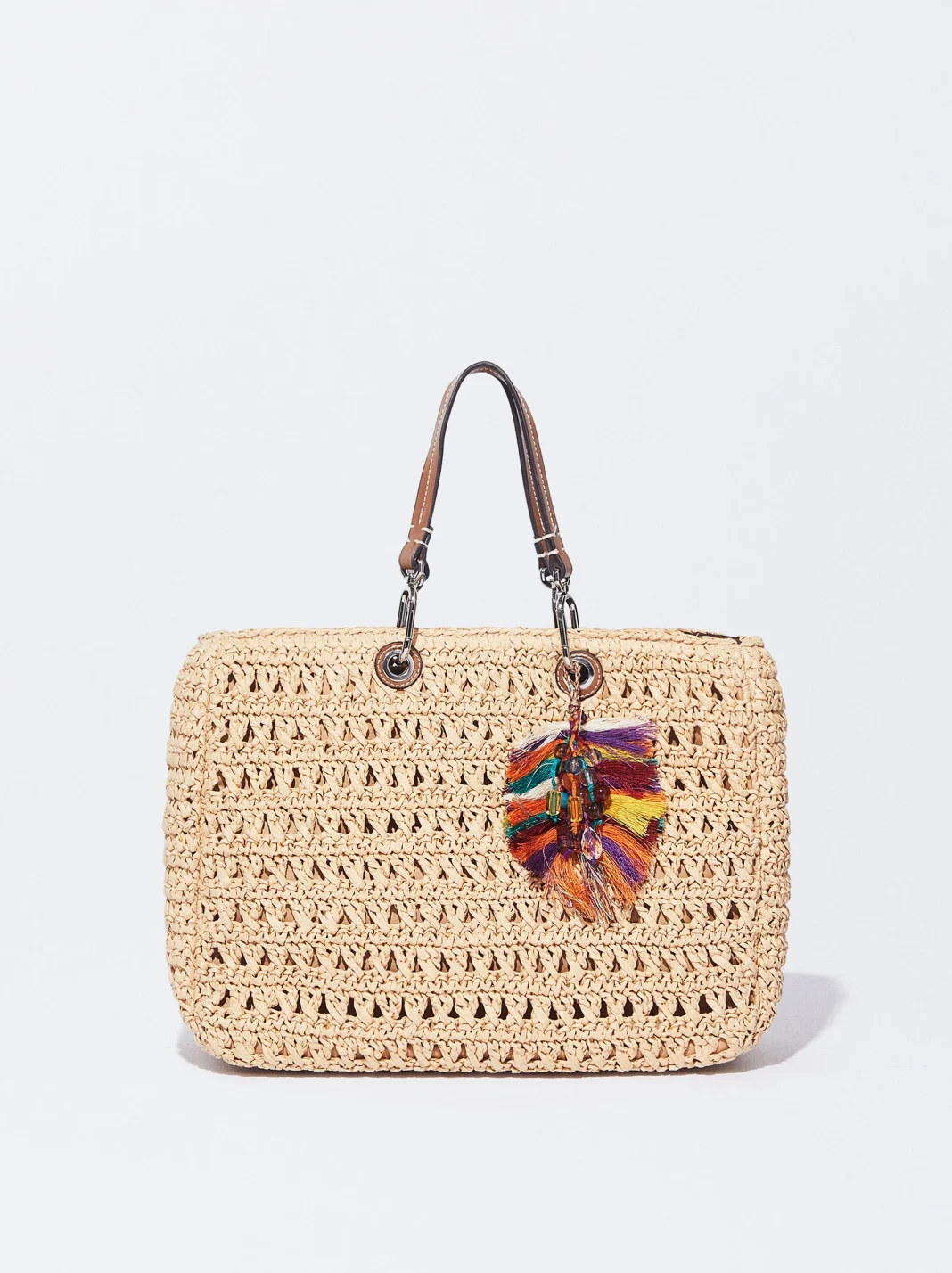 El bolso tipo tote se encuentra en plena tendencia en estos momentos. Es una opción casual, versátil y extremadamente práctica. En Parfois, ofrecen una versión ligeramente más sofisticada del clásico tote de algodón. Se trata de un bolso tote de efecto paja con doble asa de mano extraíble. Además, cuenta con una asa bandolera de tejido ajustable y también extraíble. El cierre se realiza mediante una cremallera, y en su interior cuenta con un forro de mezcla de algodón. Para añadir un toque de color, incluye un colgante multicolor. Sus dimensiones son de 29x24x11 cm (Largo x Ancho x Alto). Se presenta en un elegante color beige natural y está disponible por un precio de 27,99 euros.