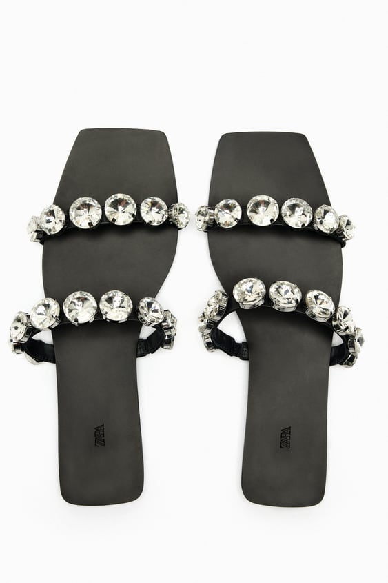 En Zara, hemos encontrado un modelo que cumple con todas las características que buscamos en una sandalia joya. Fabricado en piel vacuna de color negro, cuenta con dos tiras en la parte delantera que están adornadas con hermosos detalles de joyería. Además, su altura de suela de tan solo un centímetro garantiza que podrás caminar con ellas durante horas sin renunciar al estilo y glamour de su diseño.
