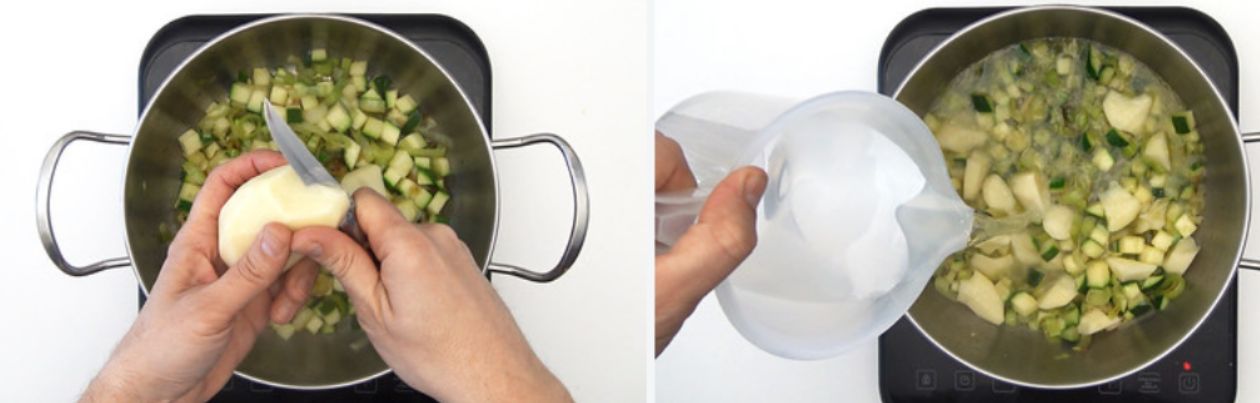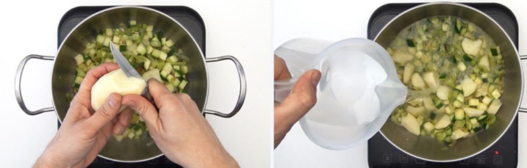 Para preparar la crema de calabacín y puerro, agregamos el calabacín en cubos a la cazuela y continuamos rehogando las verduras durante 5 minutos más, hasta que comiencen a estar blandas. Luego, pelamos la patata, la añadimos a la olla y cocinamos por 5 minutos adicionales.