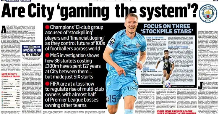 El reportaje de investigación señala que la sociedad City Football Group acapara una gran cantidad de jugadores en todo el mundo y que éstos son intercambiados entre equipos de la misma red, generando así una gran controversia en el mundo del fútbol. El artículo pone de ejemplo al Troyes en Francia, uno de los que pertenece a CFG. En el pasado mercado de verano fueron 4 jugadores del City los que pasaron a formar parte del equipo francés de la Ligue 1, jugadores que sumaban entre todos más de 18 años en el club inglés y sin haber disputado ni un solo minuto con la camiseta ‘sky blue’. Todo ello sucedió en un momento en el que se discutía en el seno de la FIFA introducir una regla de limitación de cedidos internacionales.