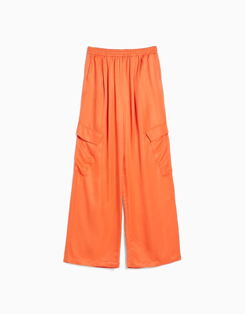 El pantalón wide leg está arrasando, y es que lo tiene todo: es cómodo, elegante, se puede combinar con todo y resulta muy favorecedor. Es de esas prendas que no te quieres quitar en todo el día. El diseño de Bershka es muy especial porque es una mezcla de pantalón cargo con la elegancia del corte wide leg de tejido fluido. Está hecho en viscosa muy suave y con un precioso efecto satinado y tiene los dos bolsillos clásicos laterales del estilo cargo. Hay tres colores a elegir: gris piedra, naranja y negro. Lo puedes conseguir a un precio de 29,99 euros.