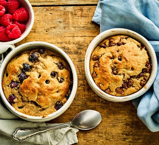 Precalienta el horno a 180ºC. En un vaso batidor, agrega los copos de avena, la leche de almendras, el medio plátano troceado, el huevo, el jarabe de arce, la levadura en polvo, la sal, la canela y la crema de cacahuete. Bate todos los ingredientes a velocidad alta hasta obtener una mezcla homogénea. Añade algunas pepitas de chocolate negro a la mezcla y remueve suavemente con una espátula. Vierte la mezcla en un molde para horno previamente engrasado. Agrega unas pocas pepitas más de chocolate en la parte superior. Hornea a 180ºC durante aproximadamente 25 minutos. Para saber si está listo, inserta suavemente un cuchillo o palillo en el centro. Si sale limpio, significa que está hecho.