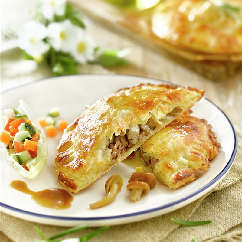 Coloca los otros 7 cuadrados de hojaldre encima y presiona los bordes con los dedos para que queden bien sellados y no se abran en el horno. Pincela cada uno de los paquetitos con huevo batido y cocina en la parte inferior del horno precalentado a 210º C durante 10-12 minutos o hasta que el hojaldre esté dorado.