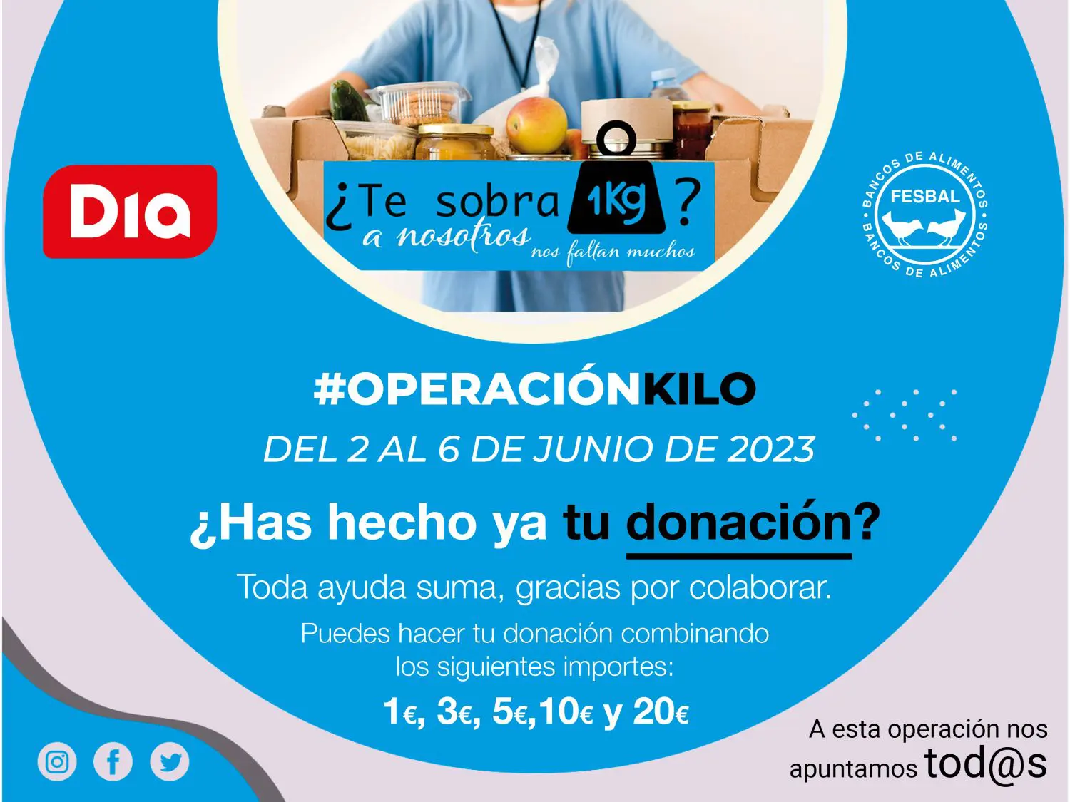Del 2 al 6 de junio Dia se suma a la “Operación Kilo”, la iniciativa impulsada por la Federación Española de Bancos de Alimentos, que tiene como objetivo la donación de alimentos para apoyar a las familias en riesgo de exclusión social. Los clientes de Dia podrán participar en esta iniciativa solidaria con sus donaciones en caja, mediante tarjetas digitales de 1, 3, 5, 10 y 20 euros, combinables entre sí.