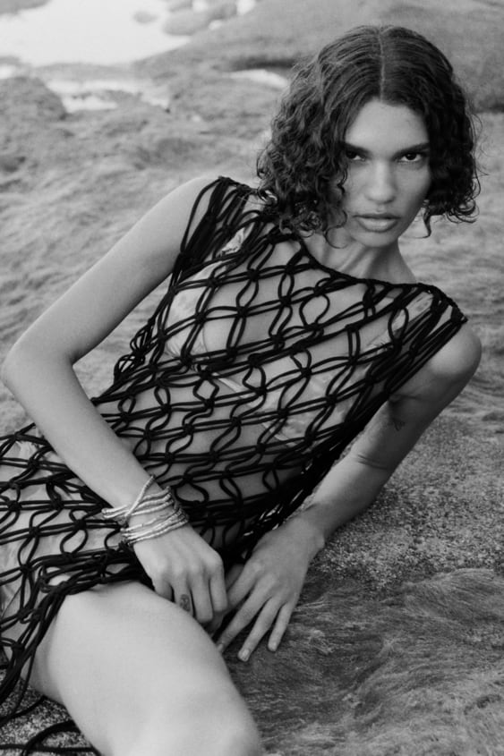El macramé está en plena tendencia y ha llegado incluso a los vestidos, como este diseño de Zara que evoca una red de pesca. Se trata de un vestido tejido con un detalle de nudo en el cuello redondo y mangas sin mangas. El bajo está rematado con flecos, lo que le da un toque único. Este vestido es ideal para usar sobre el bañador o bikini, siendo perfecto también para lucir en festivales de verano.
