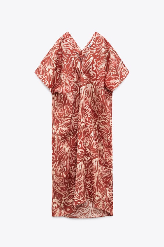 Con un corte holgado, este vestido es muy cómodo y favorecedor para cualquier tipo de cuerpo. Tiene un estampado multicolor en tonos rojos, alegres y vibrantes. En Zara, este vestido está disponible a un precio de 39,95 euros.
