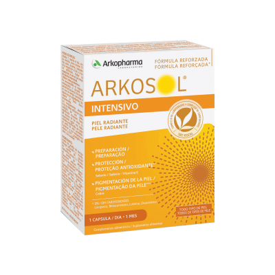 Arkosol Intensivo, de Arkopharma, un complemento alimenticio que contiene activos de origen 100% vegetal, así como selenio y cobre que contribuyen en la preparación de la piel para la radiación solar. El selenio y la vitamina E actúan en la protección de las células frente al daño oxidativo, mientras que el cobre contribuye a la pigmentación normal de la piel.
