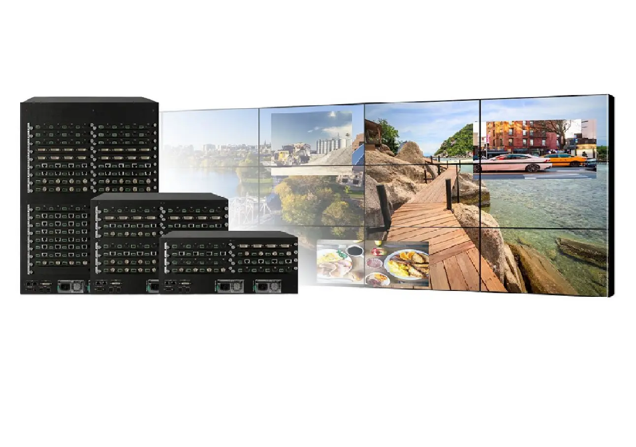 Procesadores de pared de video son el cerebro detrás de su proyecto de pared de video, y son responsables a procesar señales de entrada y salida que eventualmente muestran el. contenido en su pared de video. Los procesadores generalmente pueden administrar varias señales de entrada y combinarlas en una sola imagen de alta calidad.