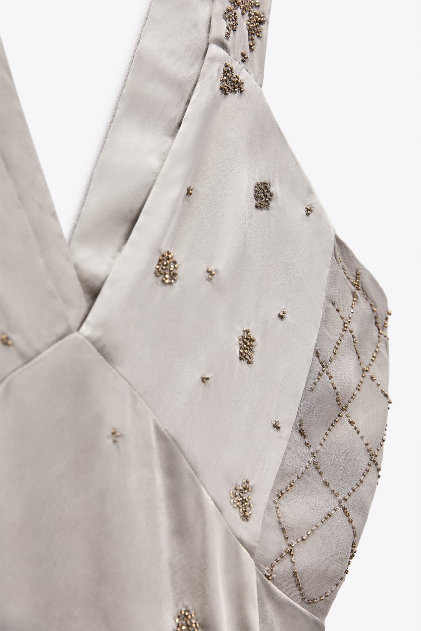 Su tono gris perla lo hacen perfecto para acrecentar el brillo de su tejido satinado. Aunque el detalle más original lo aportan sus finos bordados formados con minúsculos abalorios, que aumentan la elegancia de esta propuesta de Zara.