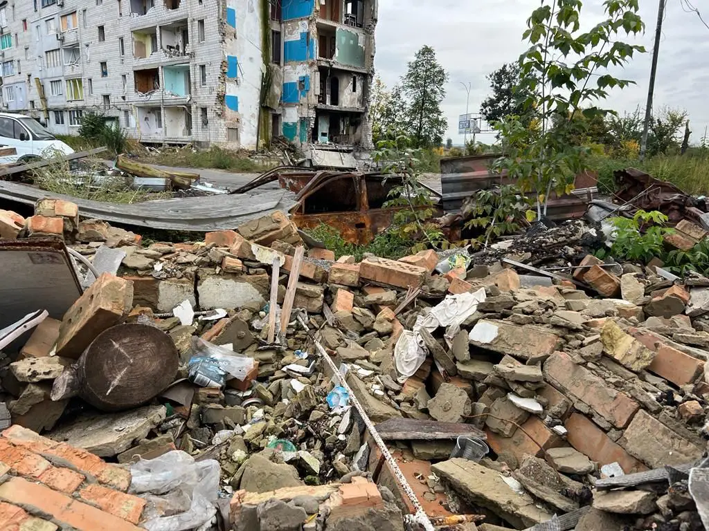 «Piedra a Piedra» está integrada por materiales de la escuela Pinocho de Borodyanka, población de unos 13.000 habitantes, situada a 50 kilómetros de Kiev. Esta localidad fue objeto de un bombardeo el 1 de marzo del 2022, que destruyó grandes edificios residenciales y causó graves daños en el centro educativo.