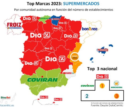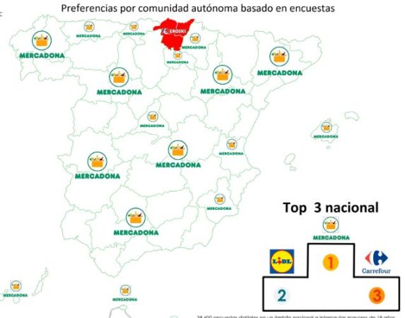 El ‘top 3 nacional’ lo completan Lidl (19,53%) y Carrefour (14,07%), vemos como el supermercado de Juan Roig se ha hecho con una legión de apóstoles, a pesar de no ser líder en cobertura en la mayor parte de comunidades.