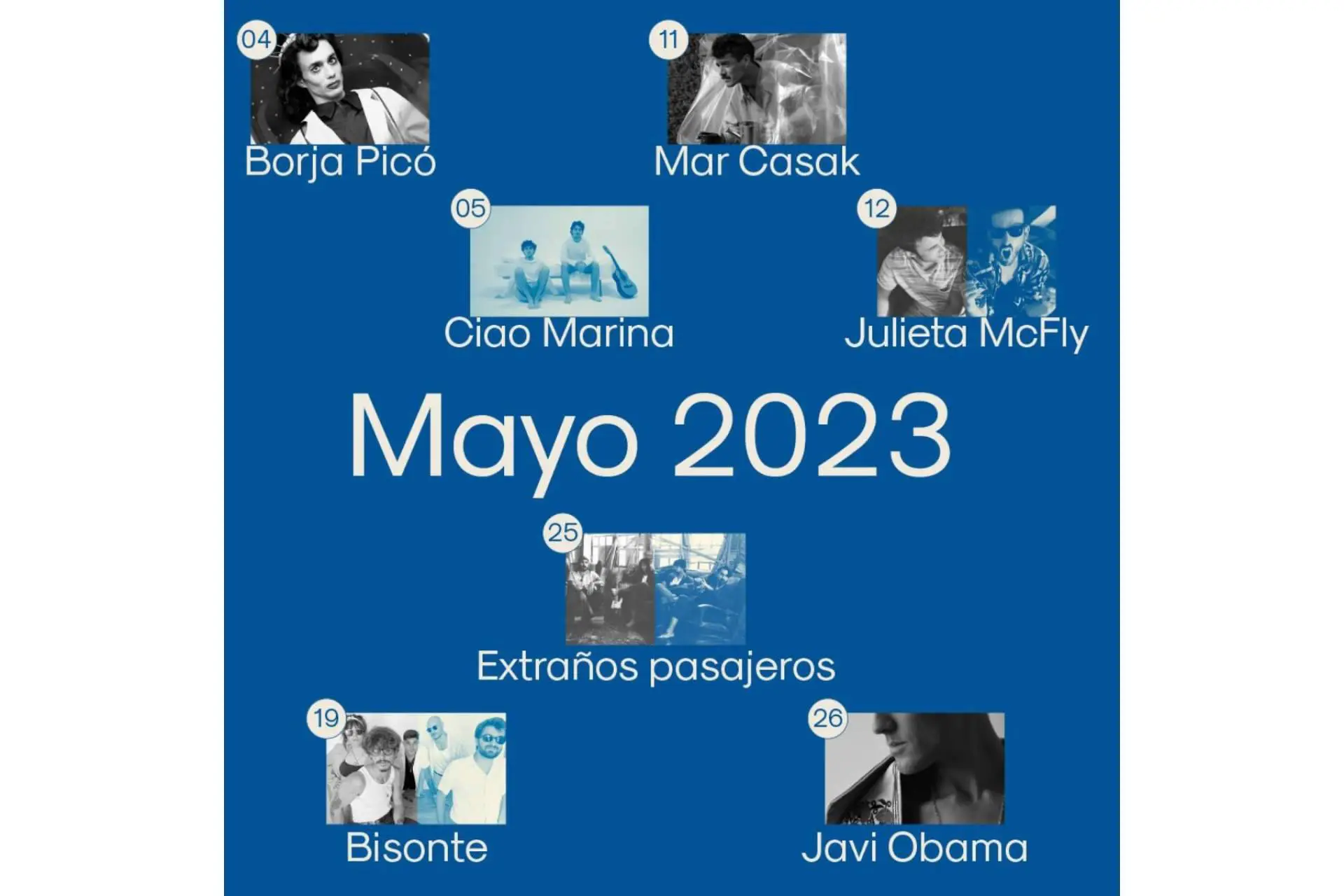 Mayo: Borja Pico, Ciao Marina, Mar Casak, Julieta McFly, Extraños Pasajeros, Bisonte, Higuanero, Javi Obama.