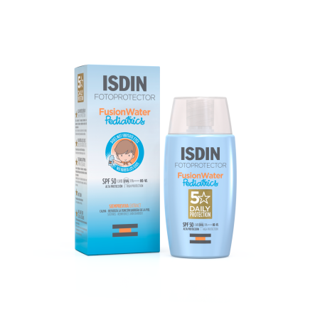 Fusion Water Pediatrics SPF 50 es el fotoprotector facial estrella de ISDIN para niños. Con una textura ultraligera de fase acuosa que se funde con la piel sin dejar residuo graso, ofrece una sensación de hidratación y frescor ideal para su piel. Fusion Water Pediatrics de ISDIN no irrita los ojos y gracias a su tecnología Wet Skin se puede aplicar sobre la piel húmeda.