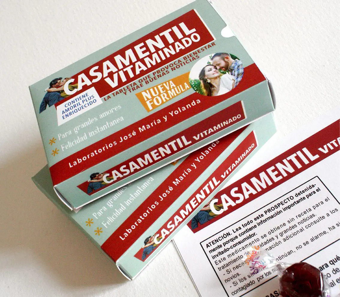 Puestos a sorprender, muchos invitados se quedan con la boca abierta al recibir la última tendencia de moda: las invitaciones de boda con forma de cajas de medicamentos. Totalmente personalizadas para los novios y con divertidos nombres que aluden a conocidas medicinas, incluyen un prospecto con toda la información sobre el enlace y caramelos de frutas en lugar de pastillas.