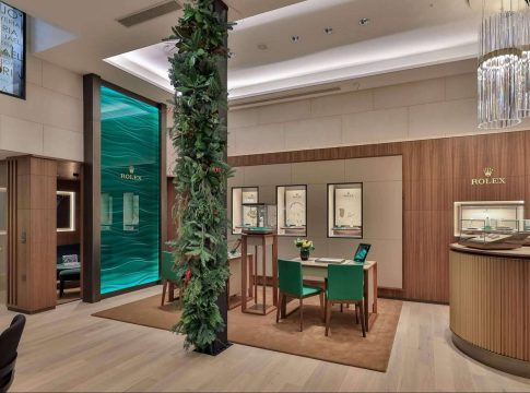 Gracias a los materiales utilizados, como la madera de nogal, la pared de aqua verde y las pieles de la más alta calidad, así como una cálida combinación de colores, se crea una armoniosa continuidad que permite que el cliente se sumerja en el universo Rolex y disfrute de una experiencia de compra inigualable.