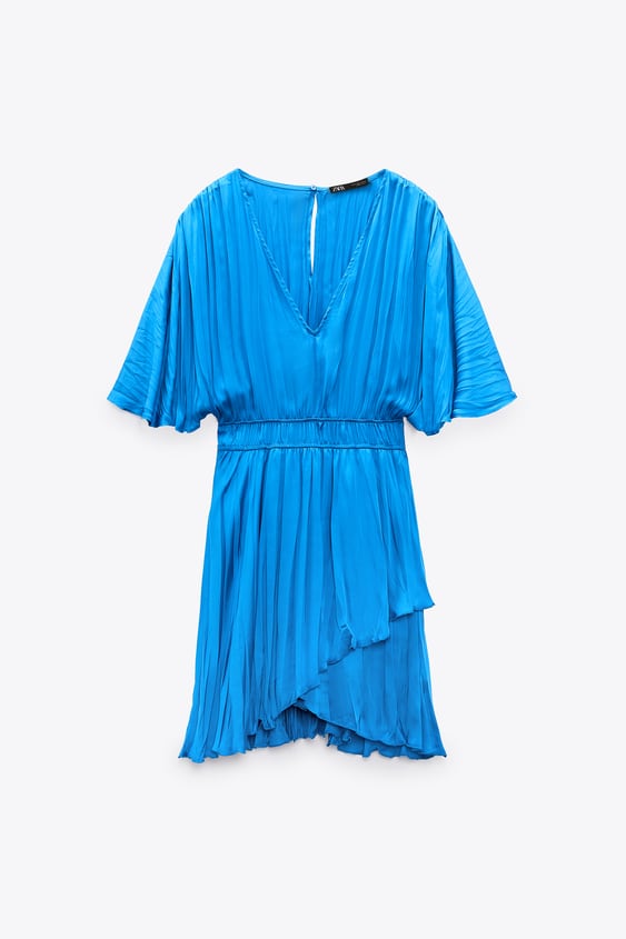 En Zara, puedes encontrar este mono con escote en pico y manga corta. Cuenta con una cintura elástica y un bajo asimétrico con un efecto cruzado. En la parte trasera, se cierra con una abertura y un botón. Está confeccionado en un 100% de poliéster, del cual el 50% es reciclado. El tejido tiene un acabado satinado y un original efecto arrugado. Este mono favorecedor está disponible en un llamativo color azulón, perfecto para lucir en conciertos y festivales de verano. Puedes adquirirlo en Zara por 29,95 euros.