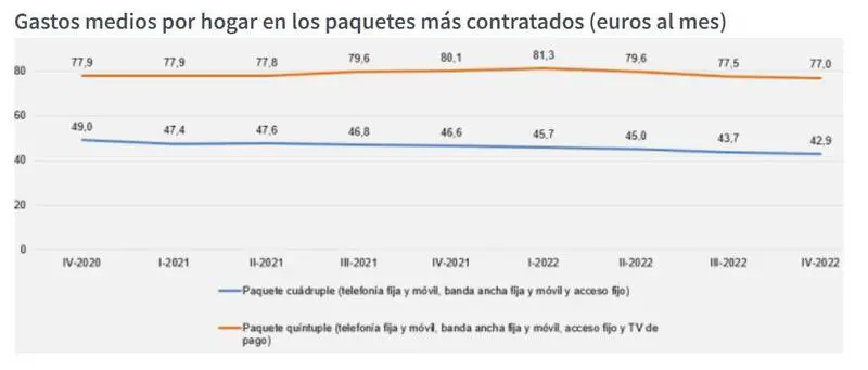 El coste al mes de los paquetes de telecomunicaciones se situó entre 42,9 y 77 euros, en función de los servicios contratados