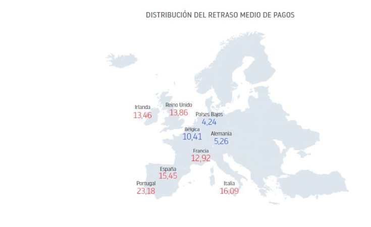 Italia es el siguiente, con 16,09 días de retraso, 1,43 días por debajo de hace un año, el mejor registro desde el segundo trimestre de 2012. Tras España, el Reino Unido alcanza una demora de 13,86 días, 0,73 días menos que hace un año.