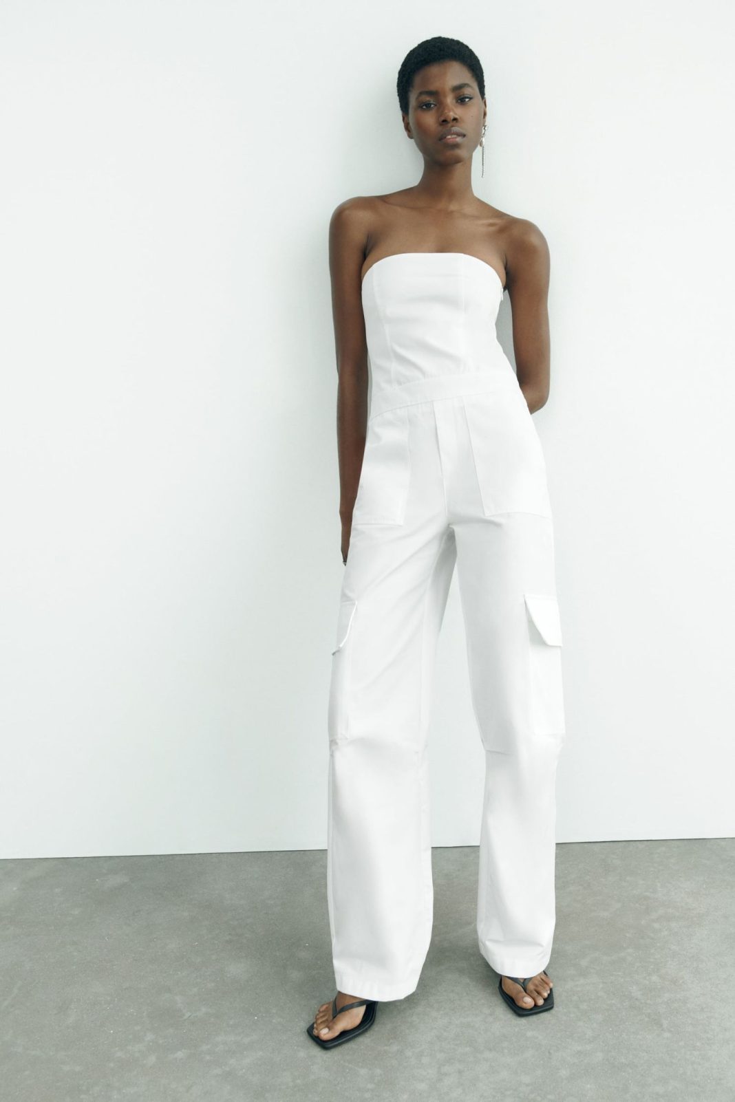 El estilo cargo se extiende cada vez a más prendas, y en Zara han sabido trasladarlo a los monos. Esta propuesta incorpora bolsillos laterales y de plastrón en pierna, en unas perneras perfectamente integradas con la parte superior, de escote recto y hombros descubiertos. Remata el conjunto su cierre lateral con cremallera oculta, y los cuatro colores a elegir: blanco, negro, vainilla y gris oscuro. ¿Su precio? Tan sólo 35,95 euros, en tallas XS a XXL.