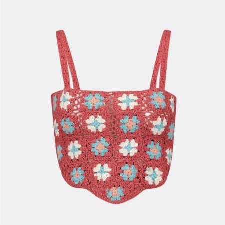 Se trata de un modelo que puedes encontrar en color rojo, y que con el mismo crochet, se ha realizado un diseño de flores de colores en la parte frontal, lo que sin duda llama mucho la atención. El modelo es de tirantes, y tiene la parte frontal asimétrica. Si quieres hacerte con este top, que sepas que aquí es donde vas a poder encontrarlo.