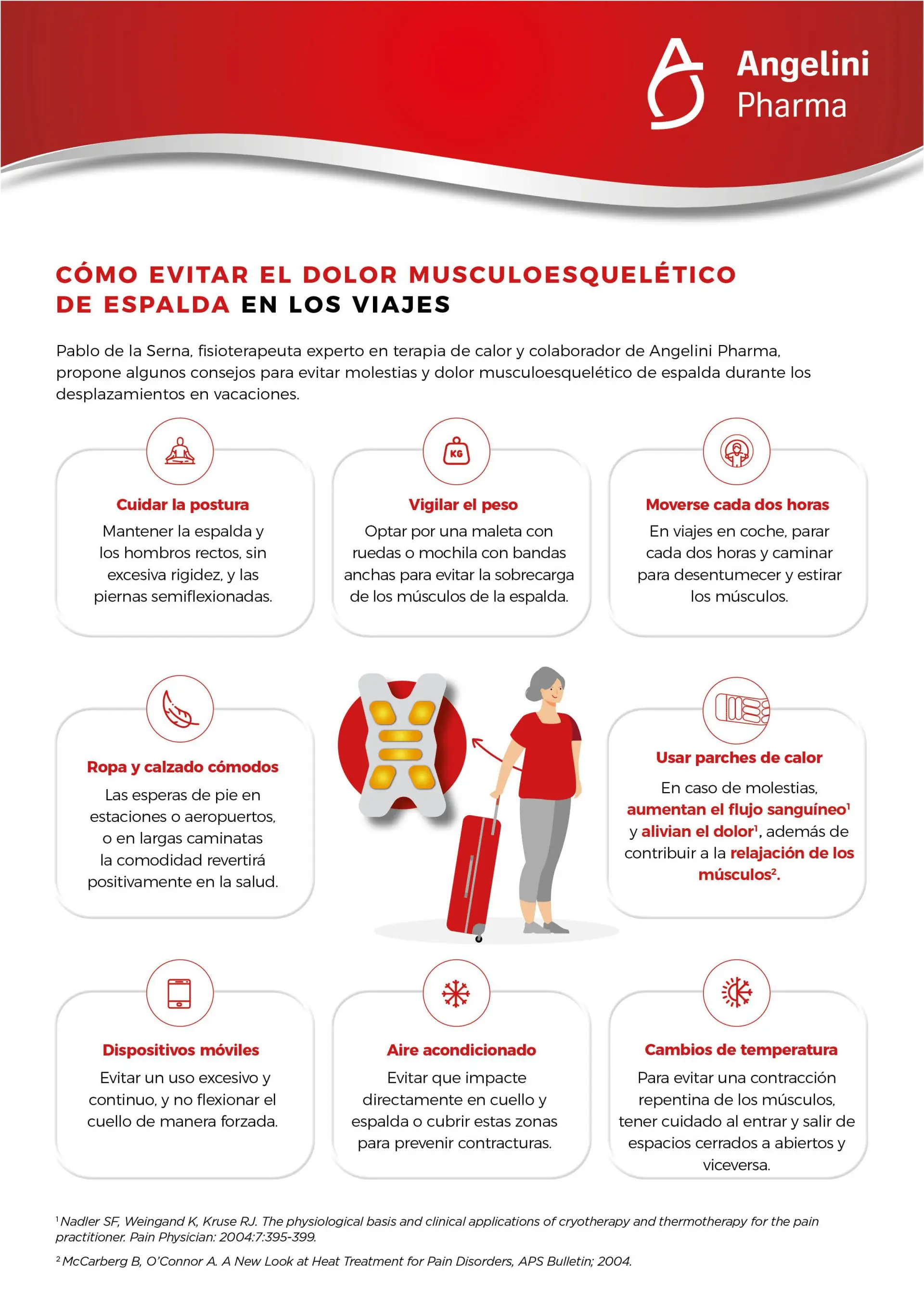 Si a pesar de tomar todas estas precauciones, aparecen molestias de espalda, los parches de calor son muy útiles durante los viajes ya que «son fáciles de colocar, muy efectivos y la mejoría se nota en poco tiempo, de manera que podremos continuar con las actividades vacacionales». De la Serna recuerda que «los parches térmicos terapéuticos aumentan el flujo sanguíneo y alivian el dolor, a la vez que ayudan a la relajación de los músculos«.