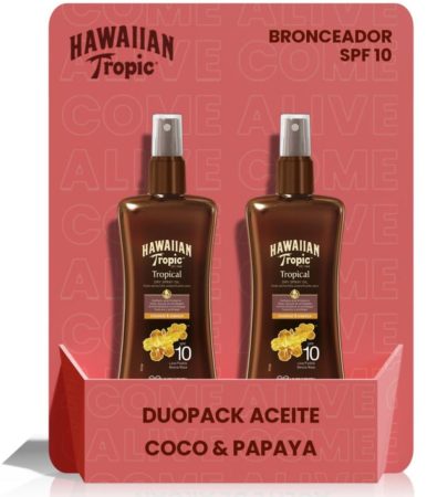 A quién no le gusta lucir un moreno perfecto, natural y uniforme. Para cumplir tu deseo y lucir un moreno que genere auténtica envidia te recomendamos compres el Aceite Bronceador Hawaiian, uno de los más reconocidos bronceadores del mercado. Por tan solo 10,4€ te llevas a casa dos botes de este aceite. Se trata del duo Coco Papaya. Un bronceador SPF 10 que deja una piel suave e hidratada a la vez que permite el bronceado.