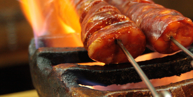 Haz cortes profundos a lo largo de la carne, creando incisiones en su superficie. Inserta una brocheta de metal a través de la pieza, asegurándote de que quede bien sujeto. Coloca el chorizo sobre una cazuela de barro y vierte aguardiente sobre la carne, asegurándote de que caiga dentro de la cazuela y cubra parcialmente el chorizo. A continuación, con ayuda de un soplete de cocina o un mechero encendemos el aguardiente para generar una llama. Con mucho cuidado, cocina la pieza sobre la llama, girando la brocheta para asegurar una cocción uniforme. Mantén la llama lo suficientemente alta para cocinar el chorizo, pero procurando que no demasiado intensa y pueda quemarlo rápidamente.