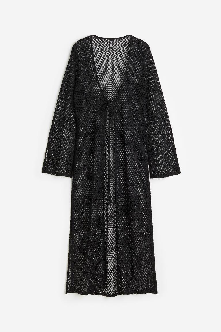 El cárdigan largo se ha convertido en un elemento imprescindible en los looks festivaleros. En esta ocasión, H&M nos presenta un cárdigan largo confeccionado en malla, caracterizado por su cuello redondo pronunciado y un frente abierto que se ata con tiras finas para anudar. Las mangas son amplias, con aberturas en los puños, y el bajo es recto, con pronunciadas aberturas laterales. Este cárdigan está disponible en un elegante color negro y tiene un precio de 29,99 euros.