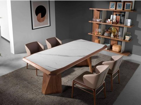 Un claro ejemplo de minimalismo lujoso es la mesa de comedor modelo Victoria, que con su gran tapa fija de cerámica con efecto mármol blanco crea un efecto de grandeza visual pero sobre una estructura en nogal de estilo minimalista.