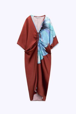 Los fruncidos vuelven a estar a la última, y cómo no con estos caftanes con opciones de fruncido que muestran lo bien que pueden quedar. Con una alta capacidad de estilizar tu cuerpo, un estampado colorido hará que te decantes por esta opción que Zara te deja también por menos de 30 euros.