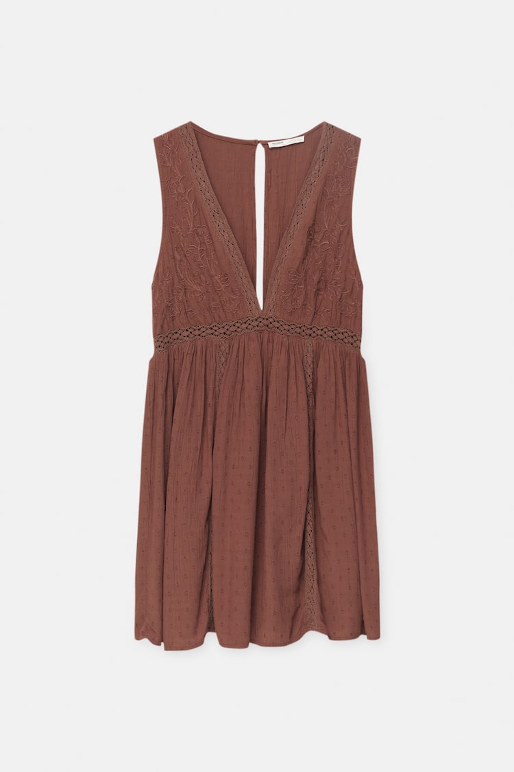 Este vestido corto de Pull&Bear tiene un gran escote en pico que realza la figura femenina, y su tonalidad marrón lo hace perfecto para combinar con accesorios y complementos dorados. Además, cuenta con bordados en la zona del pecho y del escote que le añaden un toque de estilo y autenticidad.