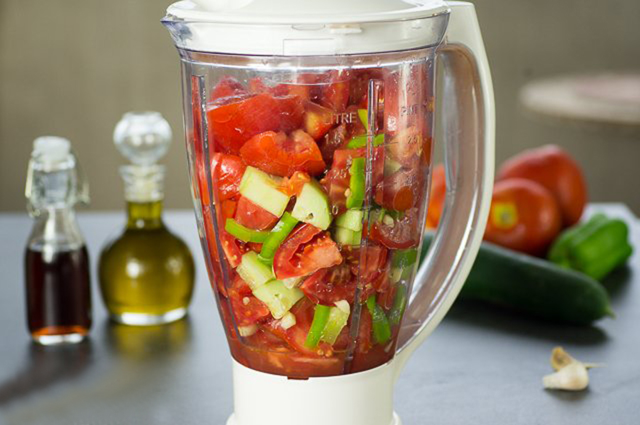 Una vez que hayas realizado los pasos previos del gazpacho andaluz, coloca todos los ingredientes en el vaso de la batidora. Añade el aceite de oliva virgen extra, que le aporta un sabor característico, junto con un toque de vinagre de Jerez para realzar los sabores de las verduras. Puedes echar también un poquito de sal que lo equilibre todo, ¡y a batir! Tritura la mezcla hasta obtener una salsa homogénea.