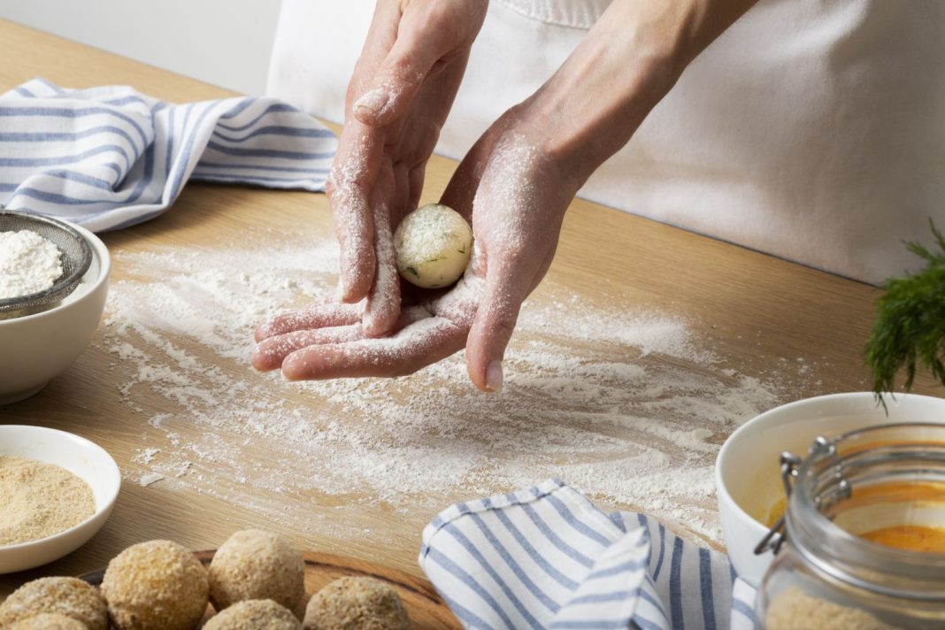 ¿Ya está lista la masa? En ese caso sácala de la nevera y coloca un papel de cocina sobre una bandeja de horno. Tienes que coger trozos y darles forma de pelota de ping-pong, que vas a repartir por toda la bandeja. ¡O en dos bandejas, si quieres hacer muchas cookies veganas! Colocadas las bolitas, aplástalas con una espátula para que tengan forma de galleta, y ya estarán preparadas para hornear.