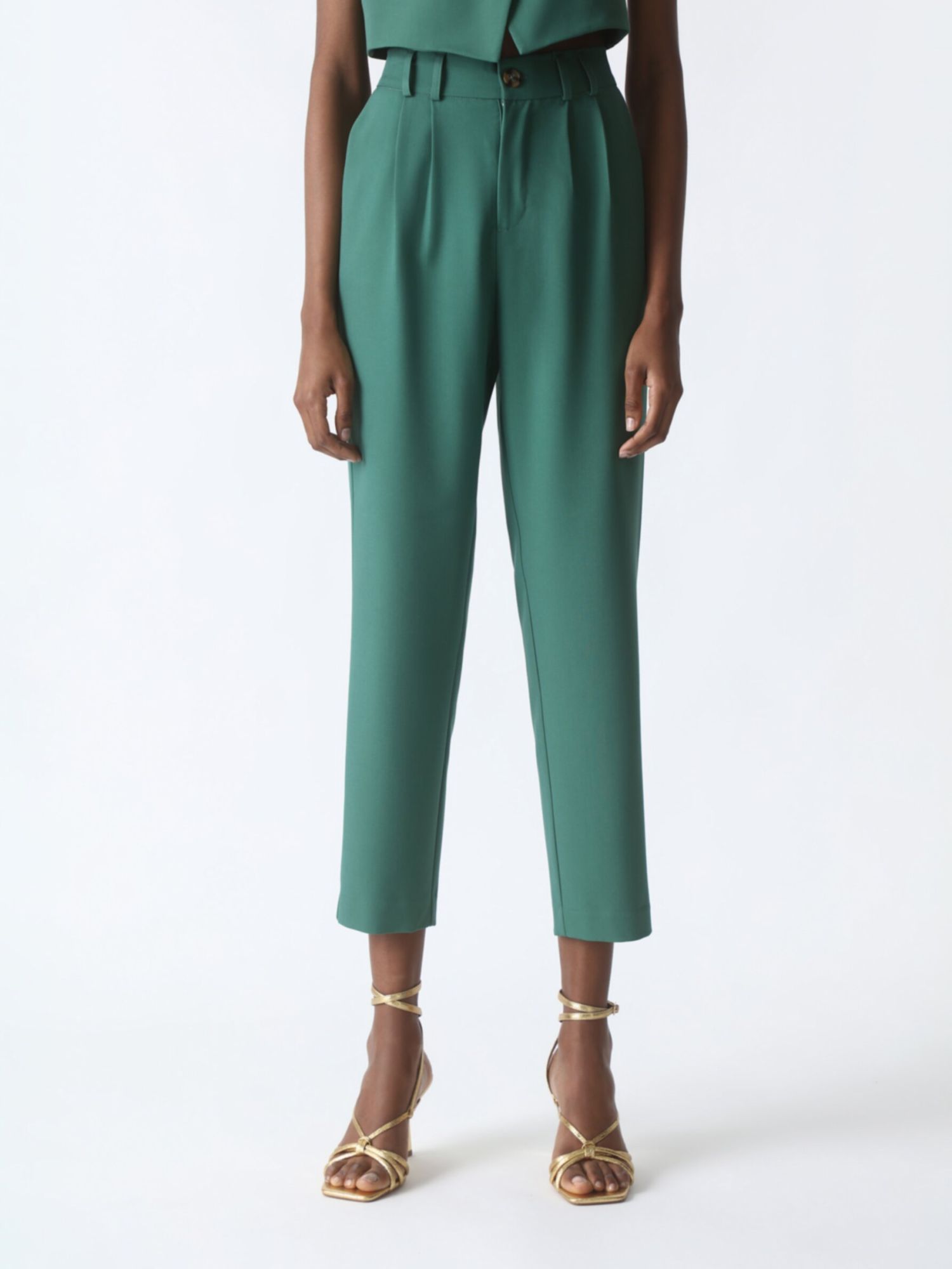 La influencer ha optado por lucir el traje al completo, chaleco y pantalón, en el color verde que hemos visto triunfar últimamente en todas las pasarelas. El punto más desenfadado lo aportan las zapatillas Converse blancas con plataforma, que, en combinación con el largo tobillero de los pantalones, estilizan y alargan las piernas. Sin duda la versión más cómoda y chic de llevar estas prendas.
