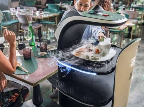Otra opción que ofrece Telsystem es el Kettybot, con funciones de reparto y recepción y pantalla de anuncios a color, de 18,5”, ideal para hacer marketing. Esta vez, Pudu Technology agrega a sus diseños minimalistas un tamaño compacto y cuerpo en forma de C inclinado hacia adelante, que facilita atravesar espacios 55 centímetros. Al ser programado con rutas adecuadas, puede servir varias mesas en un solo recorrido.