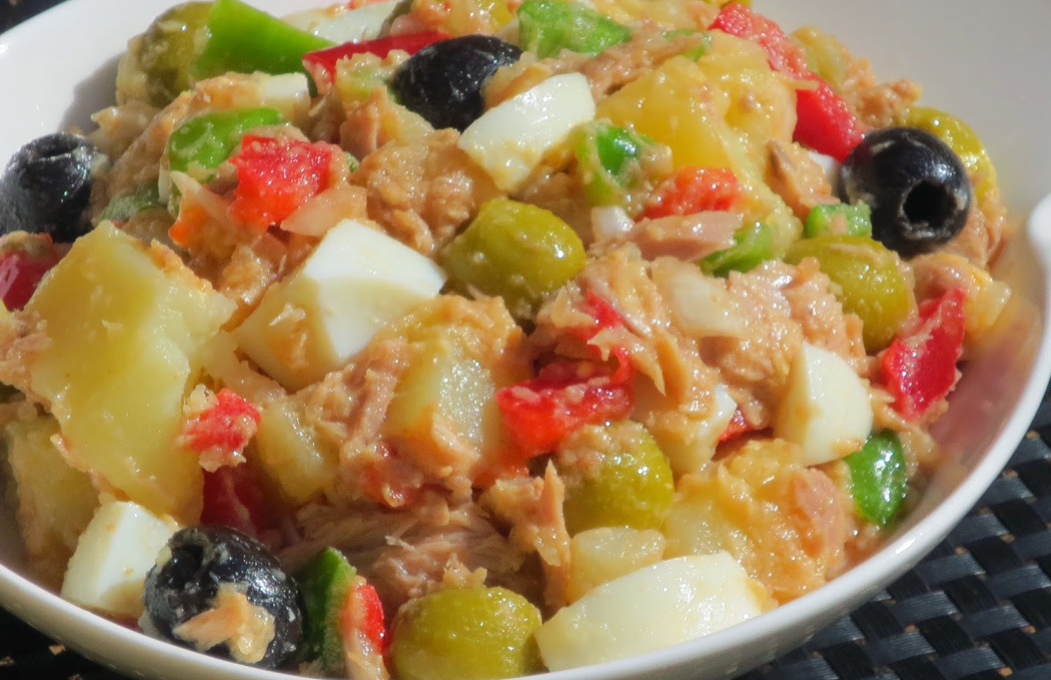 Una vez que las patatas estén un poco más frías, agregaremos el resto de los ingredientes, excepto los huevos y las aceitunas. Añade el resto de la vinagreta según tu preferencia y luego coloca los huevos cocidos cortados en cuartos y las aceitunas negras. Si es posible, es mejor utilizar aceitunas con hueso, ya que aunque puedan ser un poco más incómodas de comer, suelen tener un sabor más jugoso.