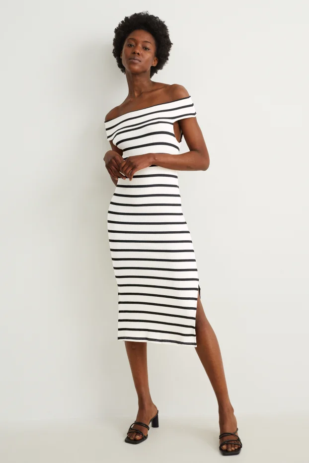 Si eres amante de las rayas, este vestido ceñido de tejido acanalado y elástico es perfecto para ti. Presenta un estampado de rayas en un diseño inspirado en el estilo marinero. El escote es de hombros descubiertos, que le da un toque sensual y femenino. La longitud del vestido es midi y el corte es estilo Body Fit, que resalta la silueta y realza tus curvas de manera favorecedora.